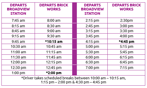 The free Shuttle Bus runs seven days a week, all year round between Broadview Station and Evergreen Brick Works. It departs every 30-45 minutes from Broadview Subway Station Parkette, located on Erindale Avenue next to Broadview Station. Our Shuttle Bus is kindly operated by our Placemaking Partner, Mulmer Services Ltd.