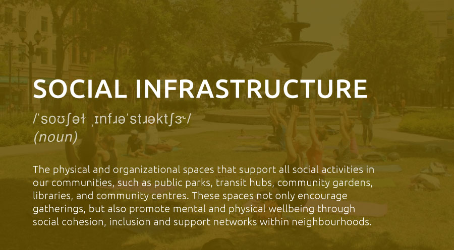 A network of public places and facilities that enable communities to learn, celebrate, express collective actions, collaborate and flourish, together. Can include libraries, parks, community centres, squares and more.