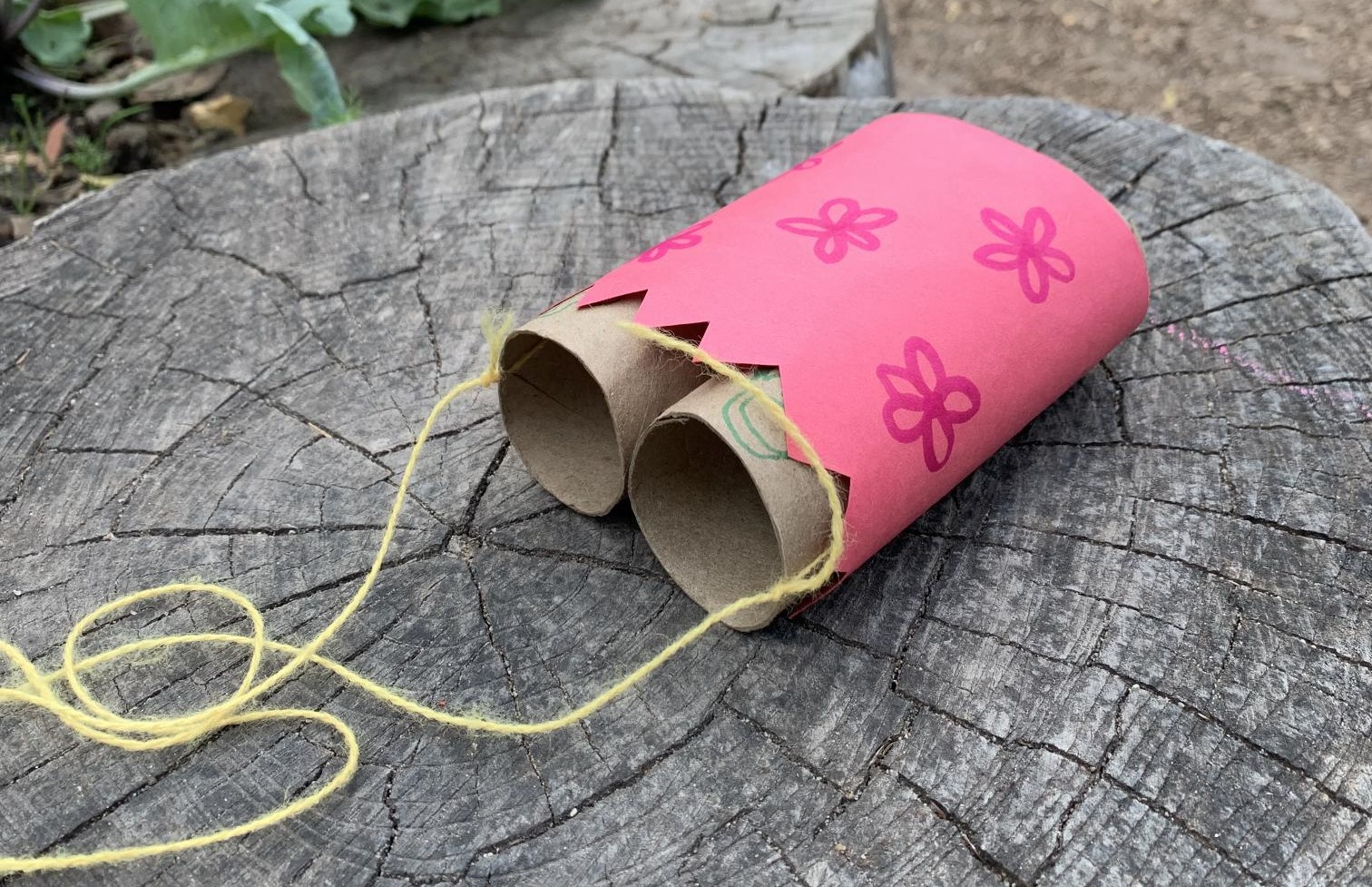 Materials needed: Two toilet paper rolls, glue or strong tape, string, scissors and decorating supplies (markers, stickers, colorful paper, etc.)