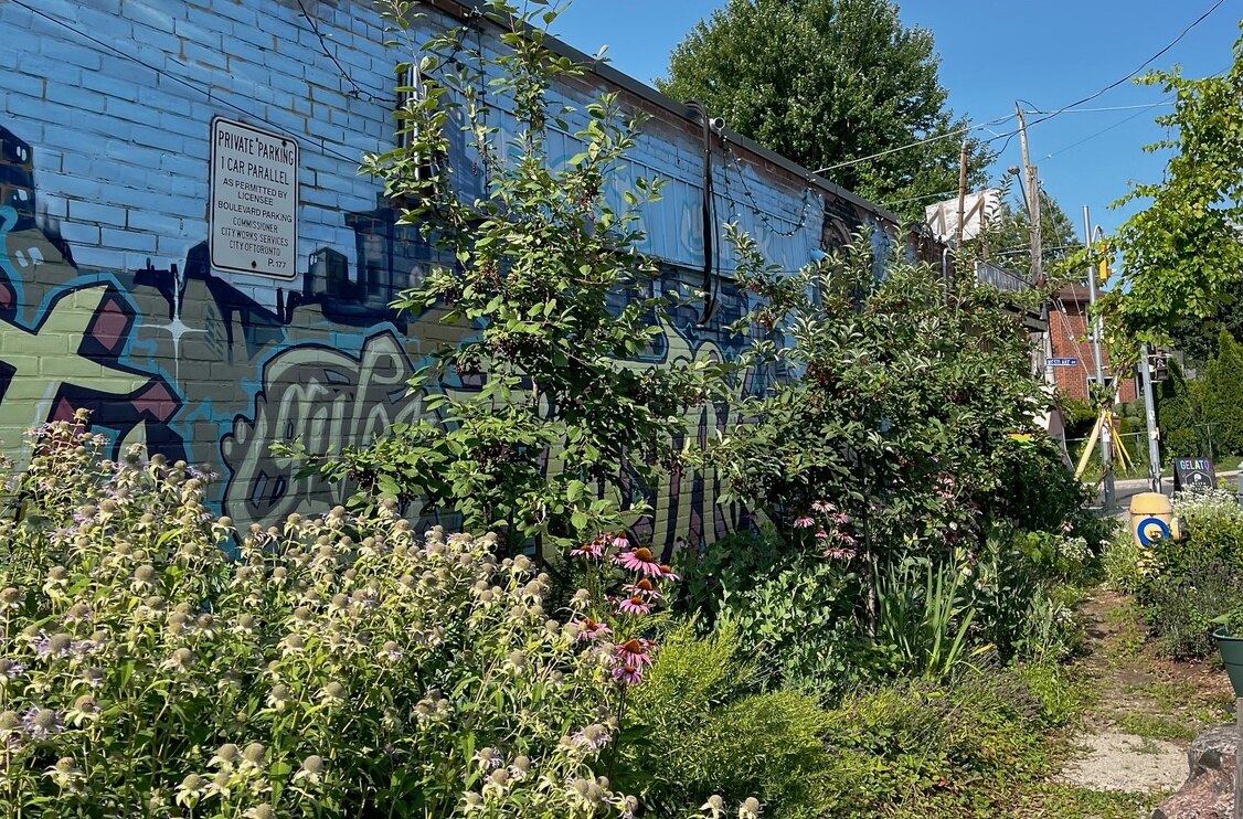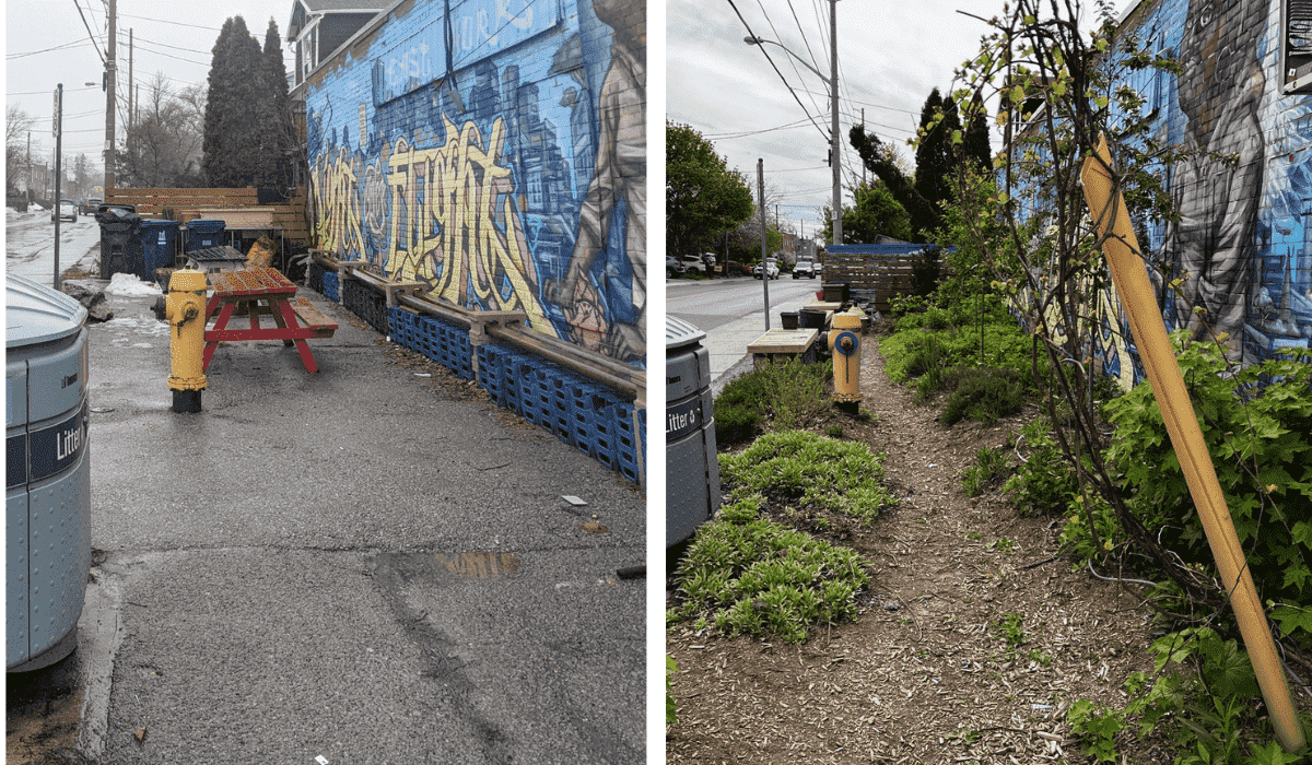 Throughout my walks around the city, I can see that every bit of green space and infiltration adds up. In 2022, I managed a project that transformed a space at Old’s Cool General Store, a corner store and community hub on Toronto’s east side. The store had a side yard which had been paved with asphalt. It was a dream of the owners to turn that space into a gathering garden and green space.
